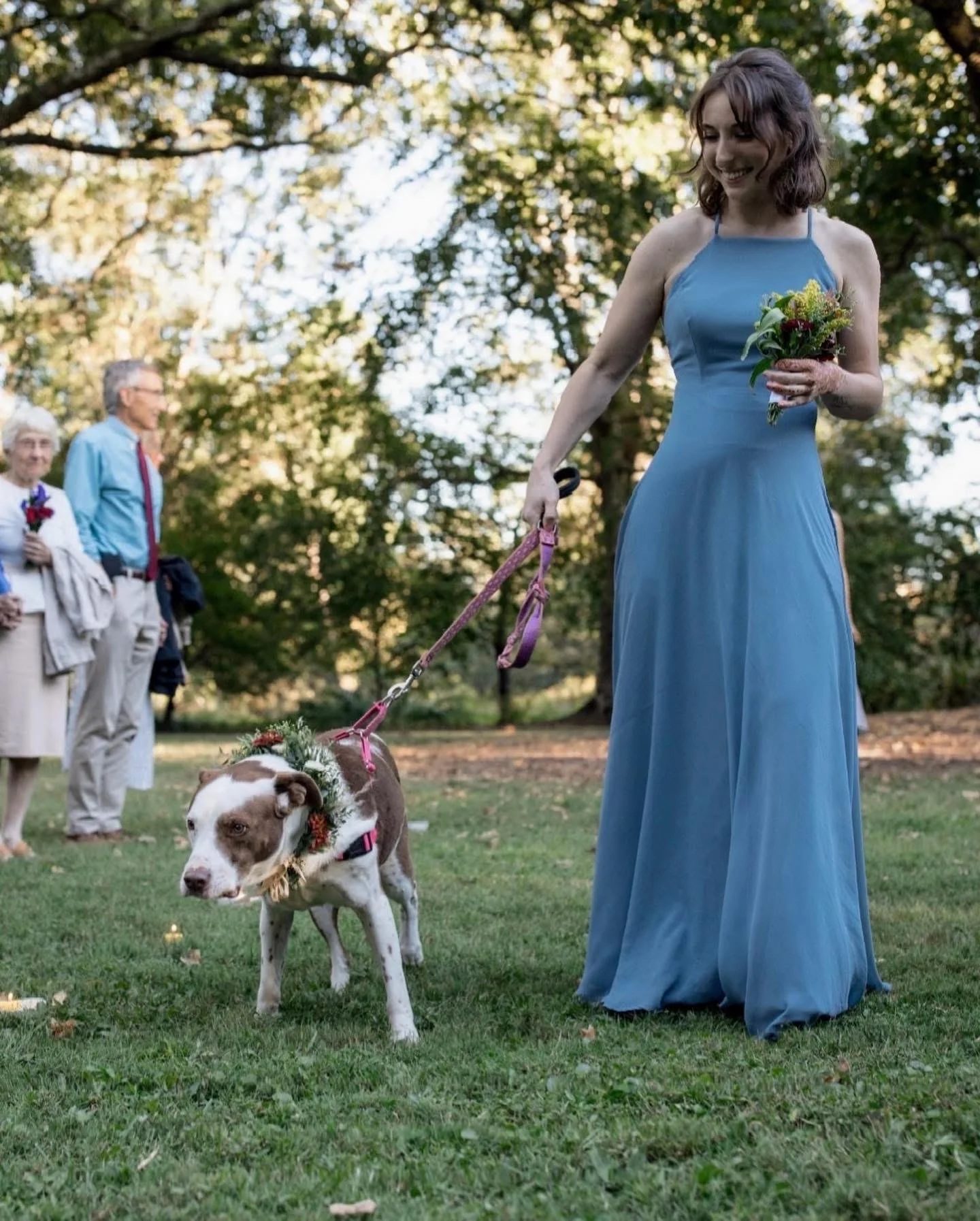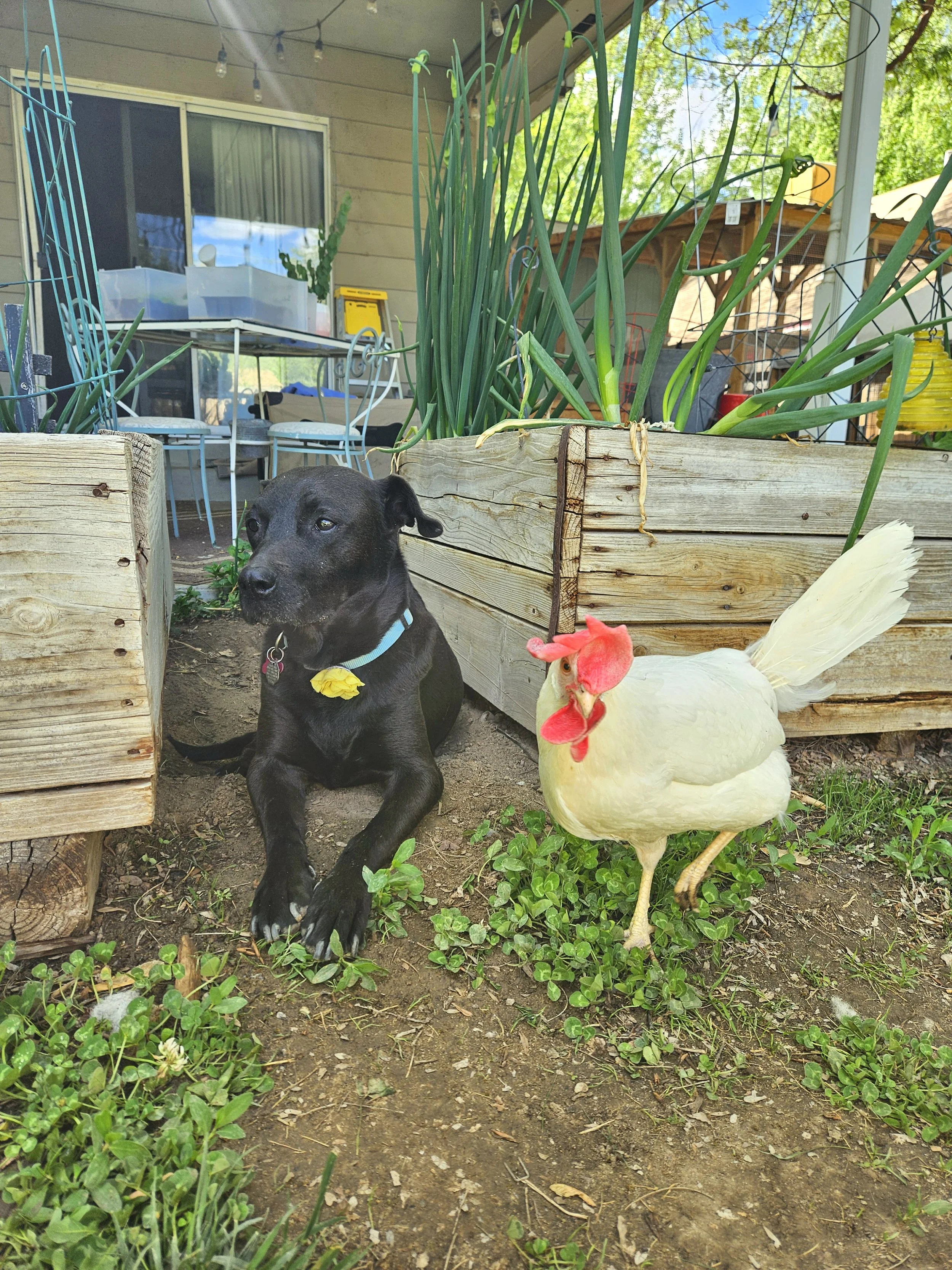 We also have a resident foster dog, Fossie, who is 14, partially blind and has severe hip dysplasia. She is living her days out at our home. She enjoys walks in her doggie stroller, dunking in her kiddie pool and hanging out with the chickens.